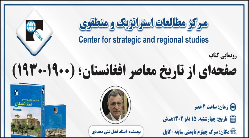 انجمن تاریخ؛ مربوط مرکز مطالعت استراتژیک و منطقوی به سلسلۀ فعالیت های خویش به تاریخ 15 دلو 1404 خورشیدی کتاب: صفحه ای از تاریخ معاصر افغانستان 1900- 1930م، نوشتۀ دکتور فضل غنی مجدد را رونمایی نمود. درین محفل، اساتید و دانشمندان مختلف از پوهنتونها و اکادمی علوم افغانستان اشتراک داشتند. همچنان، تعدادی از محققین و اهل علم، به شمول نویسندۀ کتاب، به شکل آنلاین با برنامه وصل بودند. این کتاب که حاصل سالها تحقیق دانشمند گرامی، دکتور فضل غنی مجددی می باشد، سالها قبل، خارج از کشور به چاپ رسیده بود و اینک به اهتمام رئیس مرکز مطالعات و همکاری مالی نویسندۀ کتاب، ازین آدرس مرکز مطالعات، به زیور چاپ آراسته گردید.